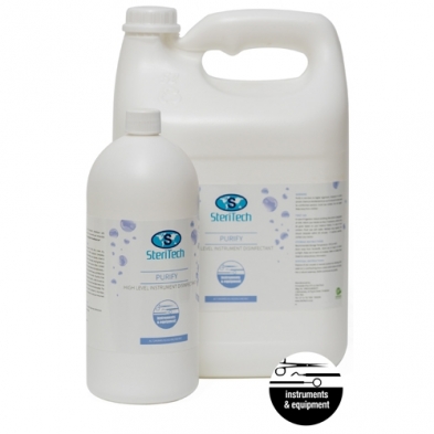 Decant the required amount of SteriTech Purify into a clean, covered receptacle. Completely immerse thoroughly pre-cleaned, rinsed and dried instruments in the undiluted product for no less than 20 minutes. Remove the instruments from the liquid using the established post-sterilisation procedure of your facility. Replace the liquid every 28 days, or as soon as a MEC Test Strip reads less than 1000ppm active ingredient, or immediately if any change in liquid colour occurs.