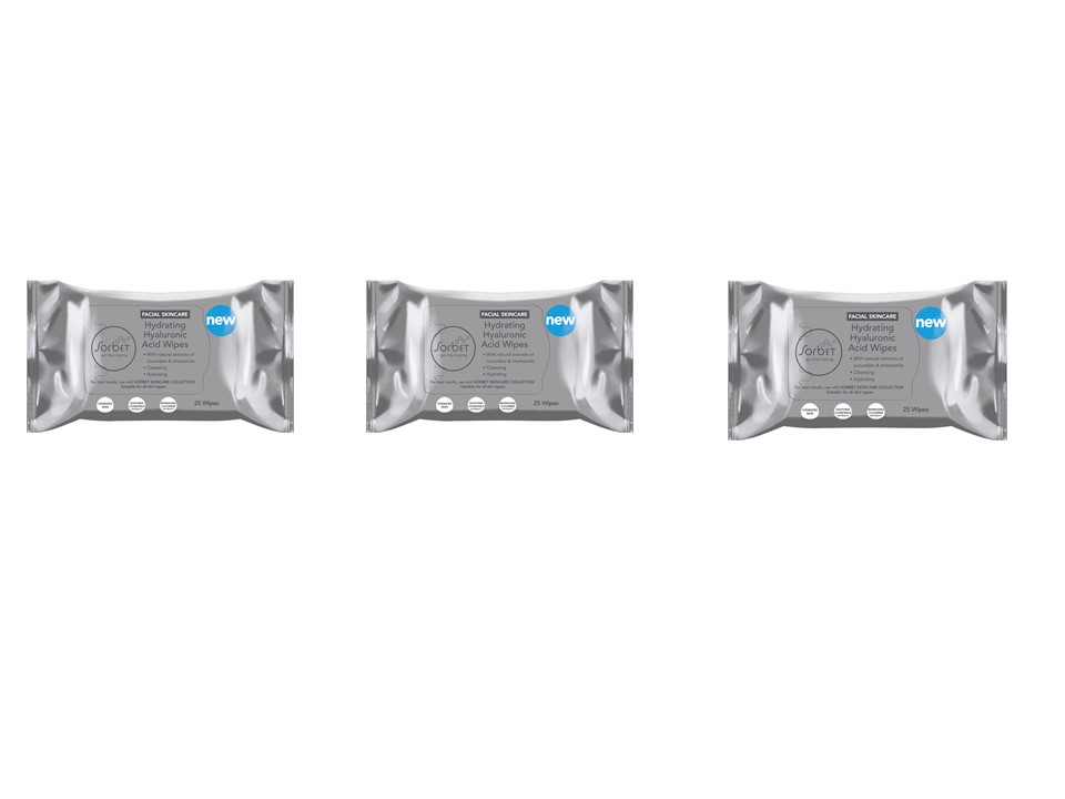 Sorbet Hydration Hyaluronic Acid 25 Wipes are deeply refreshing and hydrating, combining soothing chamomile extract with hydrating cucumber extract and hyaluronic acid. Delicately cleanses skin and draws in moisture for plump, supple skin.