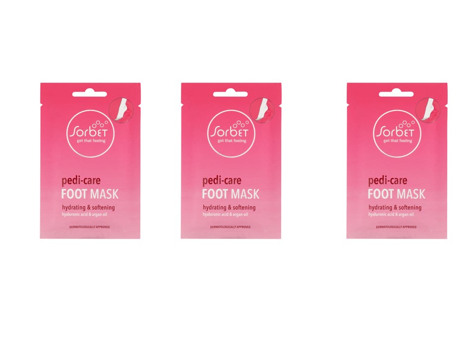 Sorbet Pedi-Care Foot Mask 18g combats dryness and roughness with a potent combination of hyaluronic acid and argan oil. Together the active ingredients draw moisture into feet and soften skin, helping them look and feel supple.