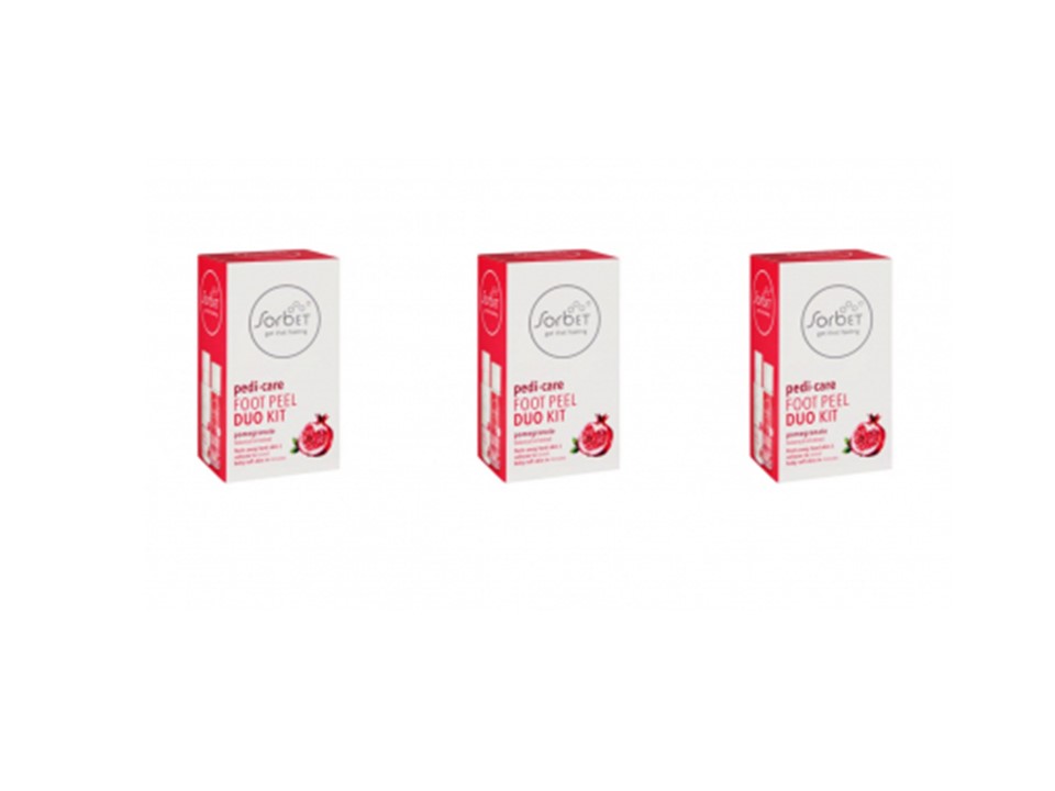 Sorbet Pedi-Care Pomegranate Foot Peel Duo Kit 200 ml gives you a complete salon professional pedicure at home. This peeling foot gel contains ingredients that slough off dead skin, while the neutralising foot tonic neutralises the peeling foot gel after the peeled skin has been scraped off.